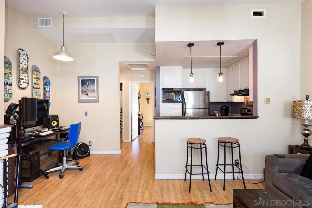 Welcome home! Top floor end unit in gated complex. Plenty of natural light, hardwood floors throughout, vaulted ceilings, cozy fireplace in Living room, Dining area, stainless steel appliances, in-suite washer/dryer hookups, 2nd private laundry closet next to reserved parking spot, water heater, attic fan, dual pane sound control and tinted windows and sliding door. Recently landscaped common area featuring a water fountain and seating area. Low HOA fees, 1.6 miles to Ocean Beach Pier!! Equipment: Range/Oven Sewer: Sewer Connected Topography: LL
