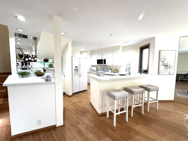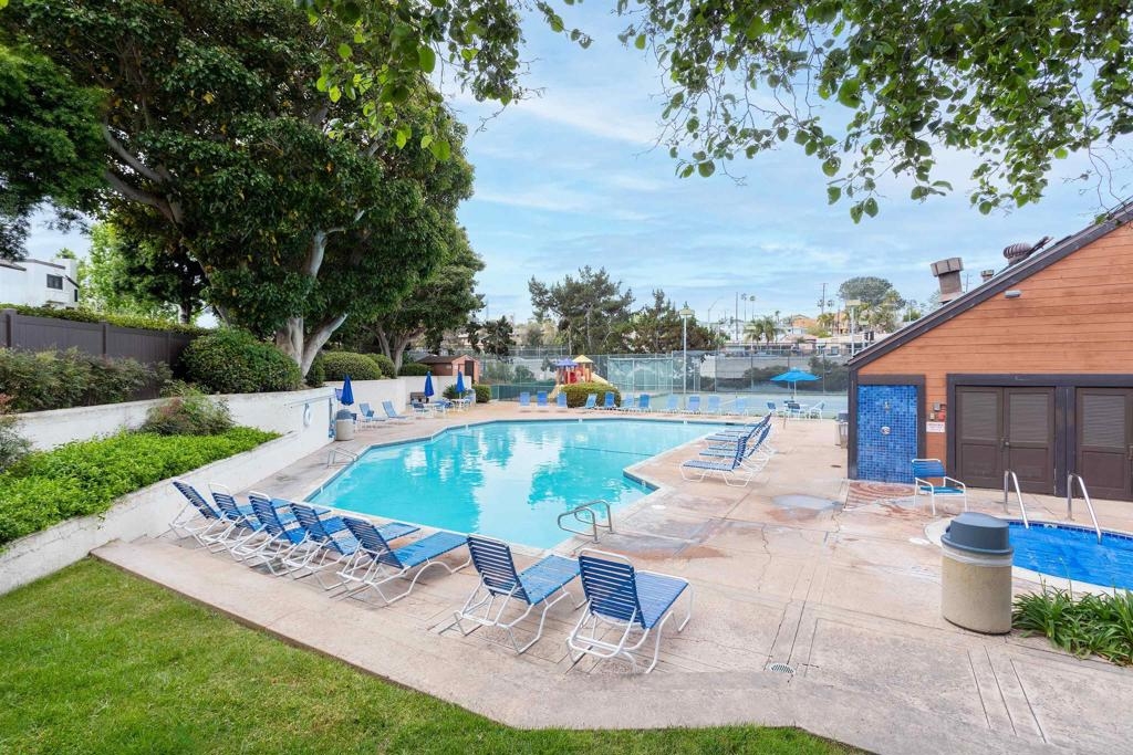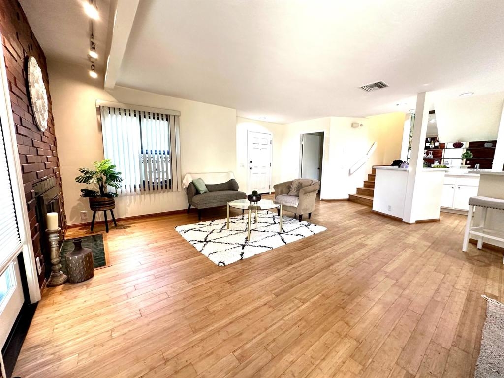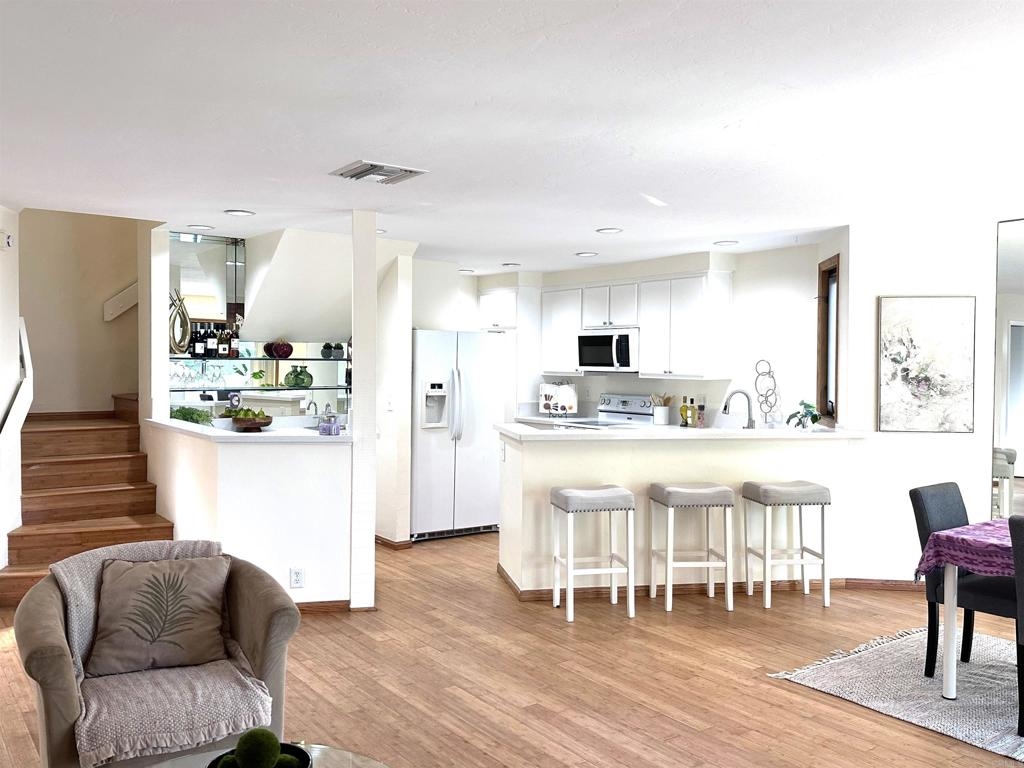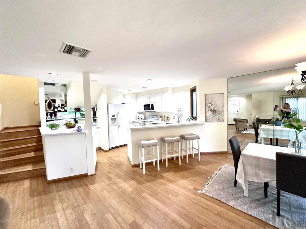 Rarely available Largest Unit 5 Plan! Remodeled and Back on the Market. Refreshed Solid bamboo flooring through out. New Paint. Refaced Cabinets. New quartz kitchen counter tops and bathroom vanity tops. AC serviced with new Freon, Wired for Surround Sound. New angle stops, new private unit emergency water shut off and pressure regulator, new sinks and new faucets throughout. New Waterproof Laminate tile look flooring in the upstairs bathrooms. This is a great community to live in. There are so many benefits to living here with the community pool, jacuzzi, tennis courts, club house, sauna, playground and centrally located. Light and Bright with awesome breezes! All windows were replaced by the quieter home project with Dual Windows! The homes lives like a single family home. The primary bedroom is over sized with room for an office or sitting area. Each room has it's own connected full bathroom. The garage is also oversized with an upgraded double insulated garage door! Only the 5 plans have the oversized garages. It was previously used as an office. You are just minutes from the beach. FHA and VA approved complex! Private security guard on site for added safety! Some photos are from previous staging.