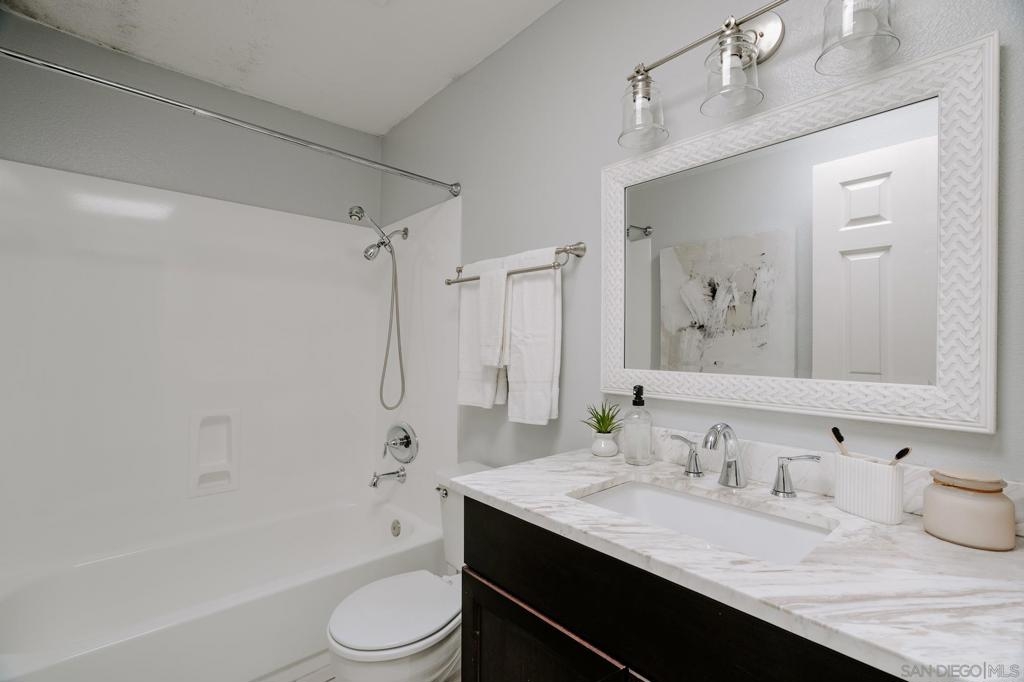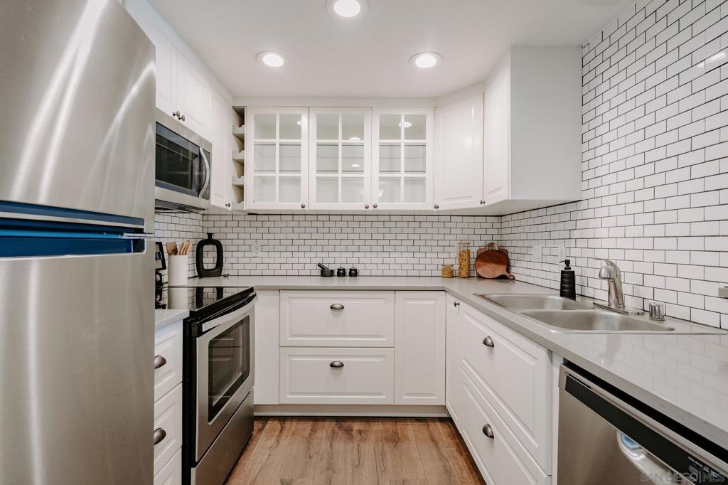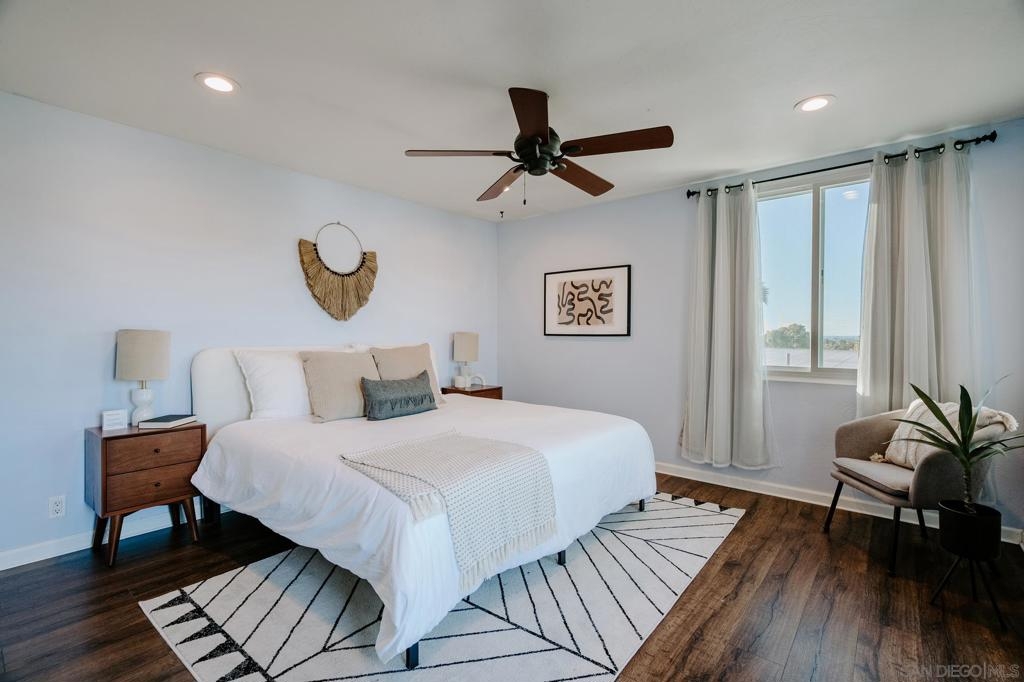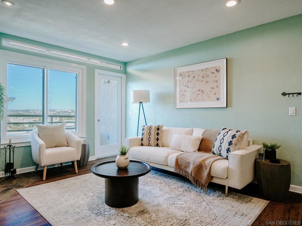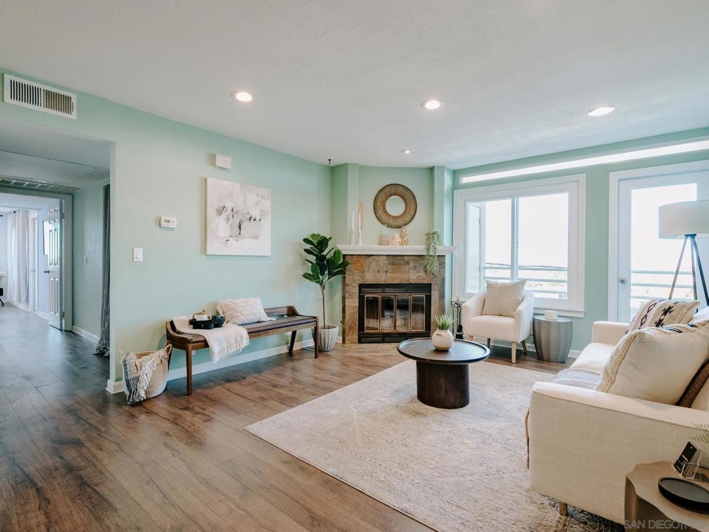 Welcome to this stunning top floor corner condo at Vantage Point. As you enter this coastal 2 bed 2 bath condo, you are welcomed into the open living and dining space that flows out to one of two patios offering incredible views of Mission Bay, the Pacific Ocean and Seaworld. Enjoy the updated kitchen featuring quartz countertops, subway tile backsplash, and stainless steel appliances. The primary bedroom is the ideal retreat paired with the private patio and water views. The home features new paint, A/C, in-unit laundry, and new triple pane windows through the Quieter Home Program. Enjoy the convenience of assigned underground garage parking and large storage area. Close to dog beach, freeways, restaurants and shopping. This is one you will not want to miss!