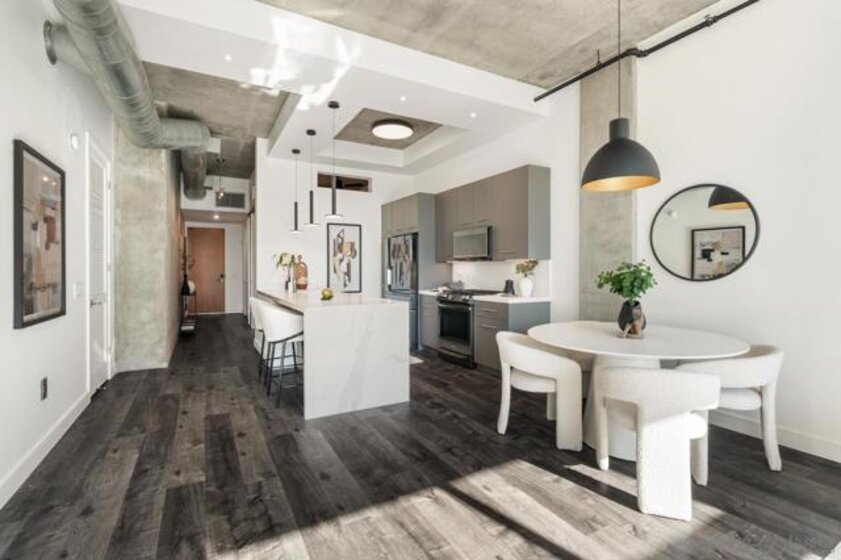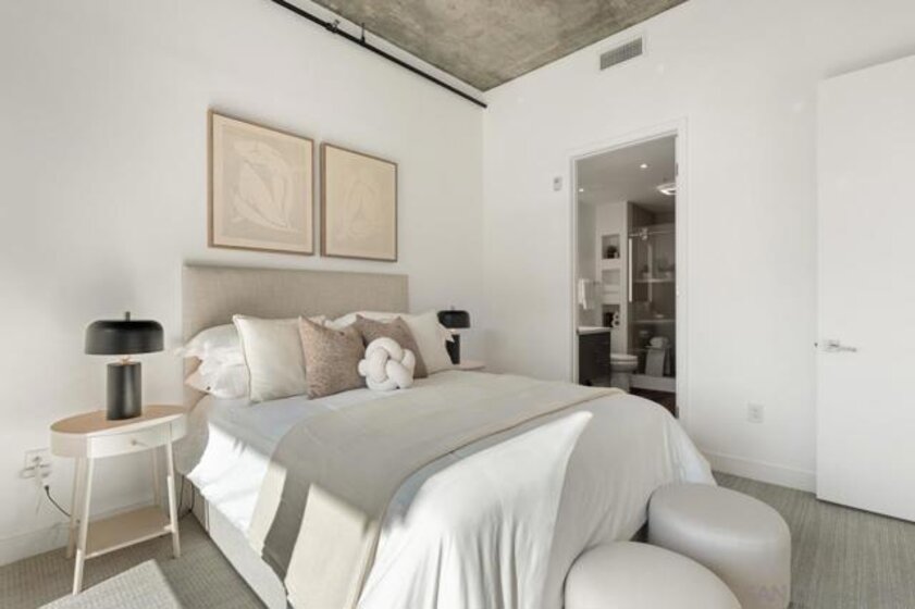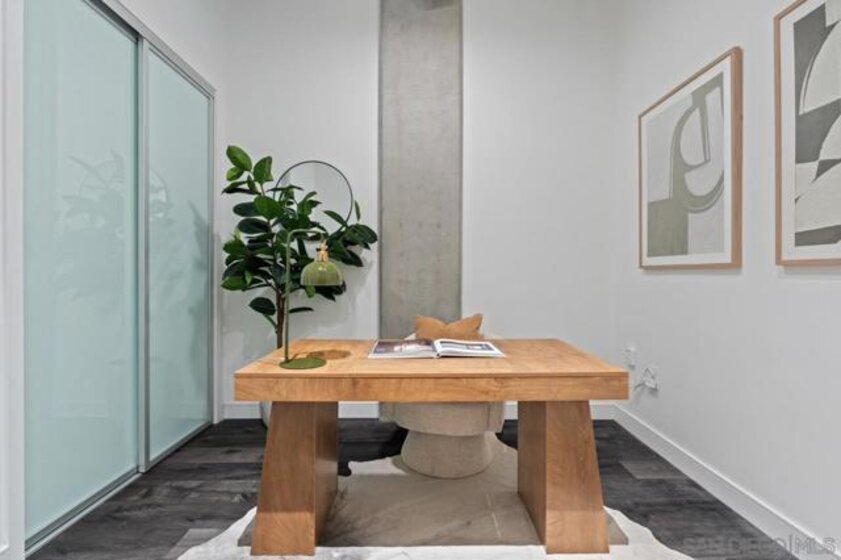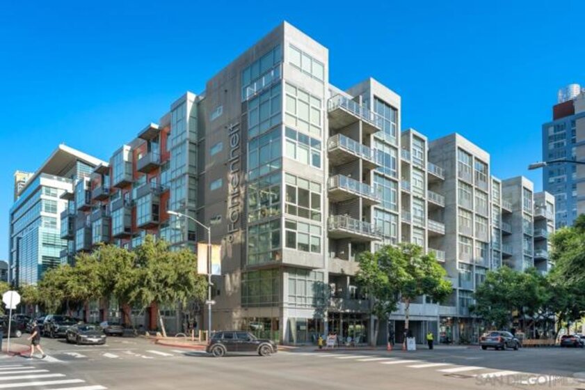 Step into a fully upgraded condominium in the heart of East Village. Designed by a principal of a respected interior design firm, this home has been thoughtfully updated with attention to detail. The open floor plan features recessed LED lighting and durable laminate flooring. At the center of the home, the kitchen is equipped with Euro-style cabinetry, Silestone countertops with a waterfall edge, and under-cabinet lighting for a clean, modern look with upgraded appliances. The bathrooms have been fully renovated with modern, high-end finishes. The primary features a glass tile shower surround with Silestone niche, ceiling rain head, hand shower, and frameless European glass door. New Euro-style vanity cabinets with Silestone countertops. The primary bedroom offers comfort with wall-to-wall carpeting and custom California closets for storage. Smart home features include remote-controlled electric shades, a Nest doorbell with camera, and SwitchBot remote access for the unit door. Building amenities include Amazon delivery lockers and Google Fiber Webpass with 1G internet—all included in the HOA fees. Nestled in the dynamic and walkable East Village neighborhood, this home blends luxury finishes with unbeatable access to San Diego’s top dining, shopping, and entertainment.