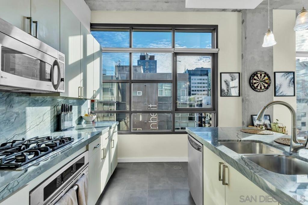 One-of-a-kind southwest corner loft at M2i featuring panoramic city views, floor-to-ceiling windows, and an expansive open layout. The flexible floor plan was designed without enclosing the second bedroom, creating a generous flow of space filled with natural light. The owners have explored building out the second bedroom, and if a buyer prefers a traditional two-bedroom layout, the sellers are open to covering the cost of this option. The home was upgraded from top to bottom. The kitchen and baths feature designer quartzite counters and sleek porcelain tile. The living areas offer authentic hardwood floors, upgraded fixtures, and custom window coverings. Central AC provides strong climate control throughout the unit. The layout supports multiple uses including a home office or guest space. The building offers fast wiring options for remote work. Oversized windows bring in natural light throughout the day and enhance the corner exposure. Residents enjoy top-tier amenities: a fully updated fitness center with brand-new equipment, a lush courtyard, and a large rooftop deck with BBQs and a fire pit - perfect for entertaining. The home includes two reserved underground parking spaces, and the HOA supports EV charger installation. The location is one of the best in East Village. The building sits 2 blocks from Petco Park and close to restaurants, coffee shops, fitness studios, and the waterfront. Walk Score, Transit Score, and Bike Score are among the highest in Downtown, which attracts buyers who want a connected and walkable lifestyle.