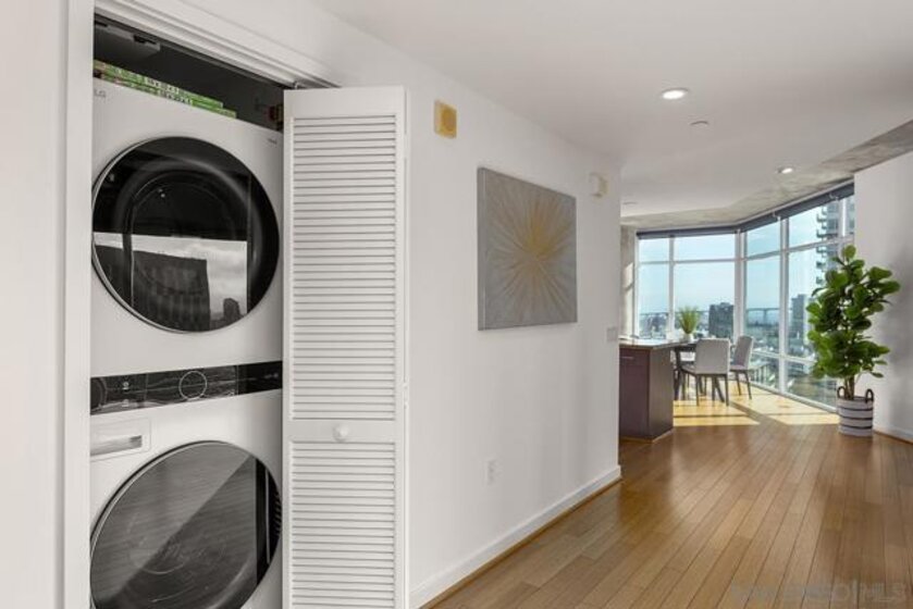 Welcome to the prime locale in Smart Corner, “The Point” floorplan, where walls of glass showcase panoramic views spanning Point Loma, the Pacific Ocean, San Diego Bay, and the Coronado Bridge from this premier south-facing residence. This spacious 1-bedroom open-concept layout is a blank slate for your vision, readily accommodating a 2nd bedroom or private den—a simple customization of adding drywall and a door unlocks the full potential of this exceptional urban home. You’ll love the modern style with loft-inspired character, complete with original bamboo flooring, exposed concrete accents, all opening to a huge balcony, a true standout feature ideal for entertaining, dining al fresco, or simply relaxing while soaking in the sweeping skyline and coastal vistas. The kitchen features stainless appliances, recessed lighting, and an eat-at bar for casual dining. Additional highlights include an upgraded washer and dryer, two excellent, separate parking spaces (rare P1 and a P3). Whether you’re seeking a stylish city residence, a smart investment, or a flexible live/workspace, this home offers unmatched views with a central Downtown location! VA approved. Smart Corner is an all-encompassing hub of work, play, shop, and live! It is conveniently located near the 163 freeway, I-5, Highway 94, Petco Park, the Gaslamp Quarter, San Diego City College, and Balboa Park. A trolley station located below the development ensures Smart Corner has all an urban dweller could want. Amenities include 20th floor roof-top sun deck with forever views of the city skyline, 10-person hot tub, barbecue area, wet bar, 2nd floor Fitness Center, PLUS on-site management, and security.