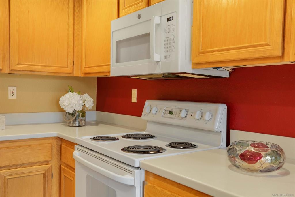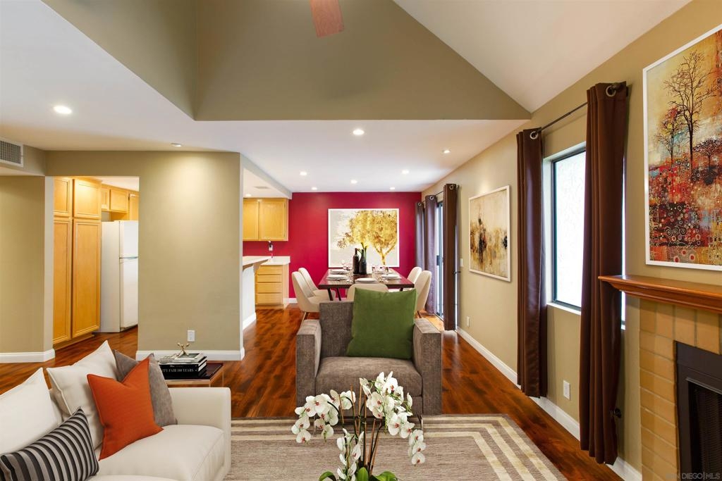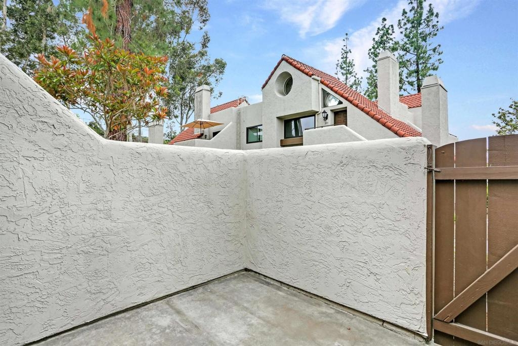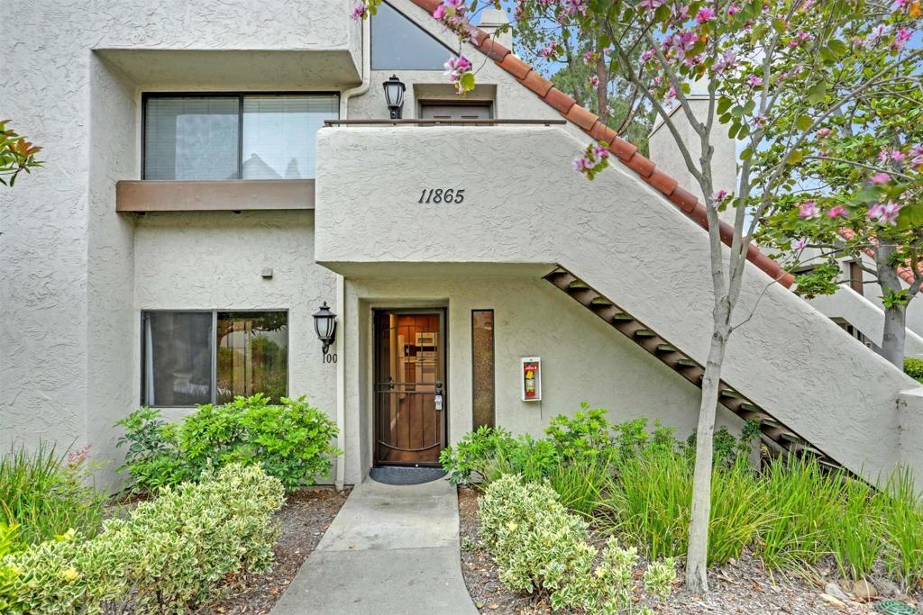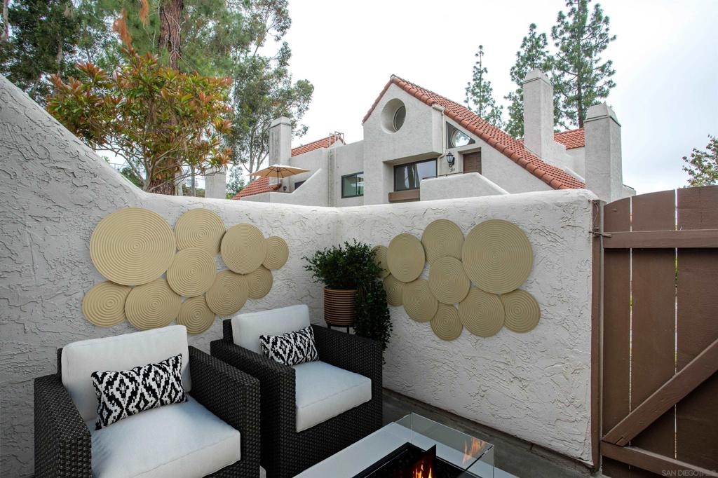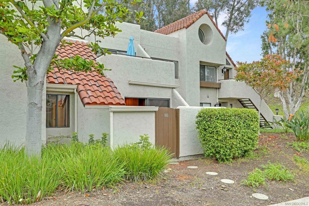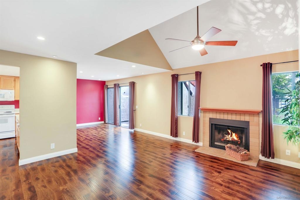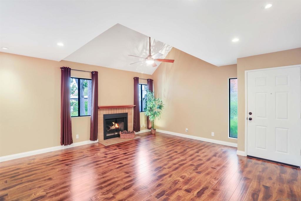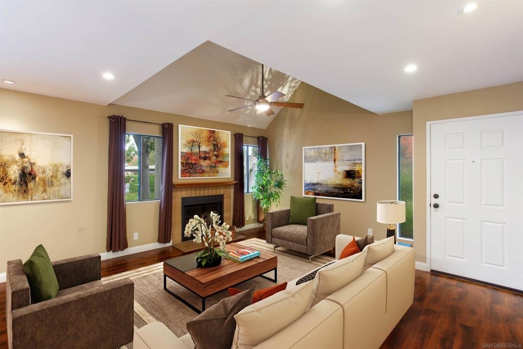 "Home sweet Home" is the theme that exemplifies this cozy 2-bedroom, 2-bathroom condo nestled in one of the quieter locations of the Bernardo Pines community. You'll appreciate the open floorplan and vaulted ceilings the moment you step through the front door. A brick hearth fireplace is the focal point of the oversized family room which opens to the adjacent dining and kitchen area. Views to the ample walled patio further enhances the overall open and welcoming feeling. (Supplement) The primary bedroom is generously proportioned and features a large walk-in closet, separate vanity, and stall shower/toilet area. The guest bedroom has 2 closet spaces and the guest bathroom features a tub/shower combo and is located just past the louvered door full-size side-by-side washer/dryer closet. Amenities abound with a community pool - spa - exercise facility - tennis court - and play area. The lush, mature landscape adds to the beauty and charm of the Bernardo Pines community. Located with easy freeway access, multiple eateries, shopping and community facilities - this Bernardo Pines condo is the perfect spot to call home! NOTE: The pictures that include furniture are "Virtually Staged" to assist with a potential visual representation of the rooms photographed.