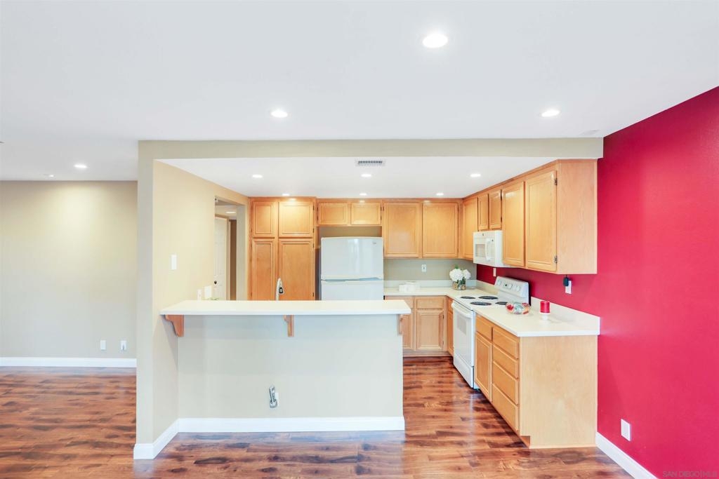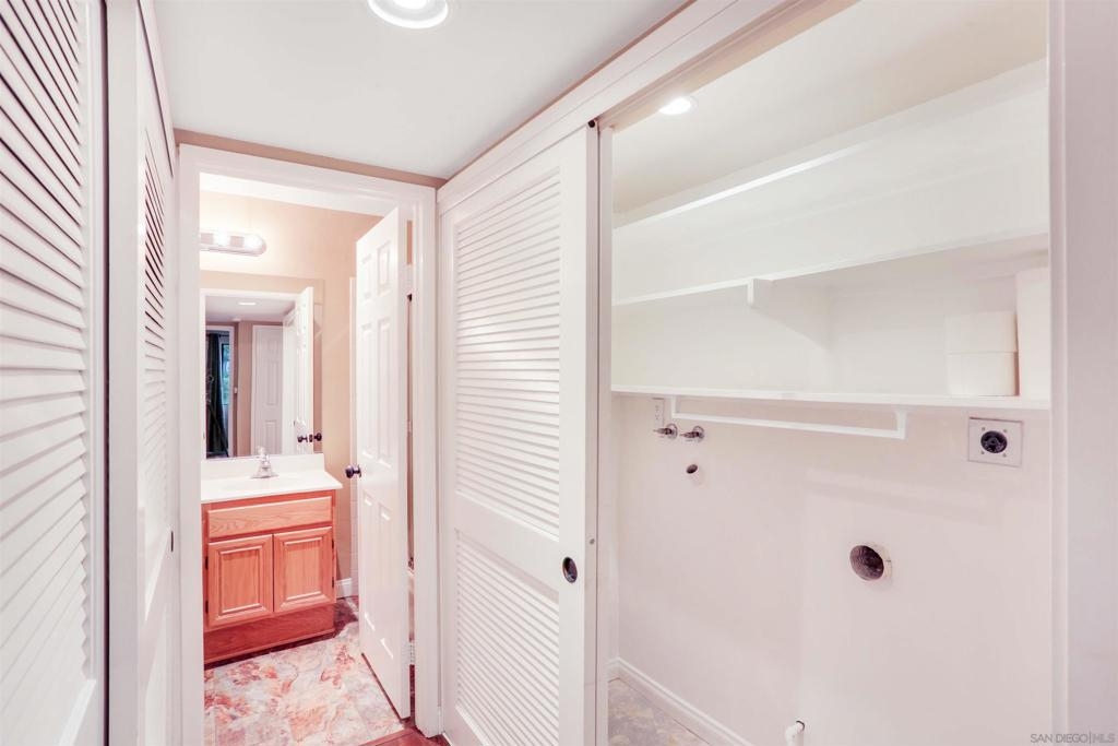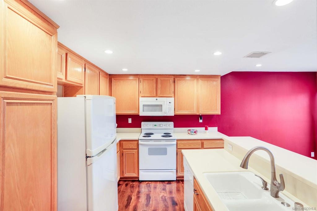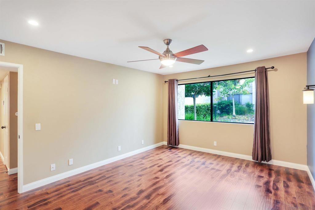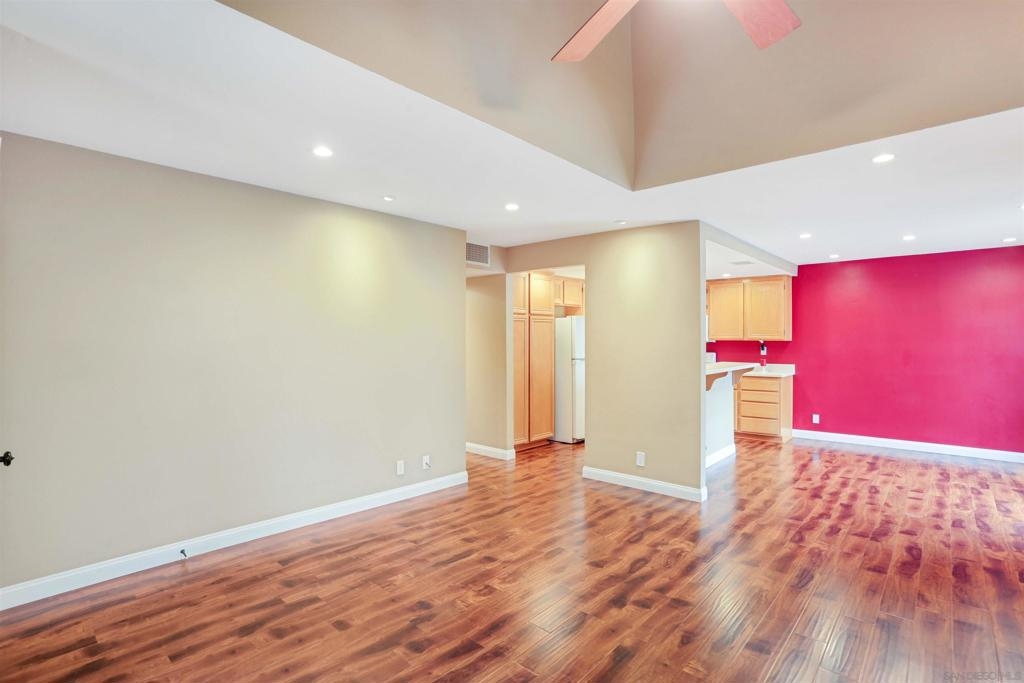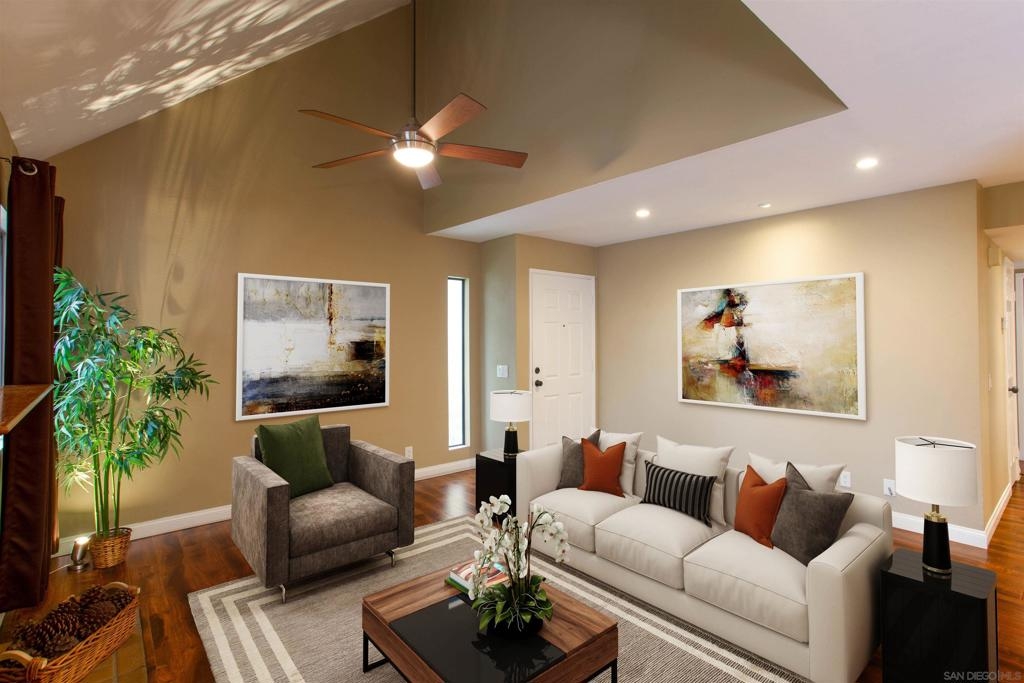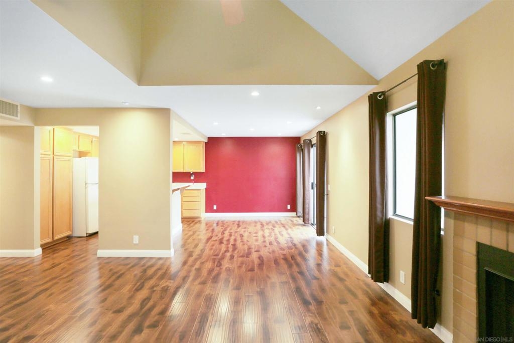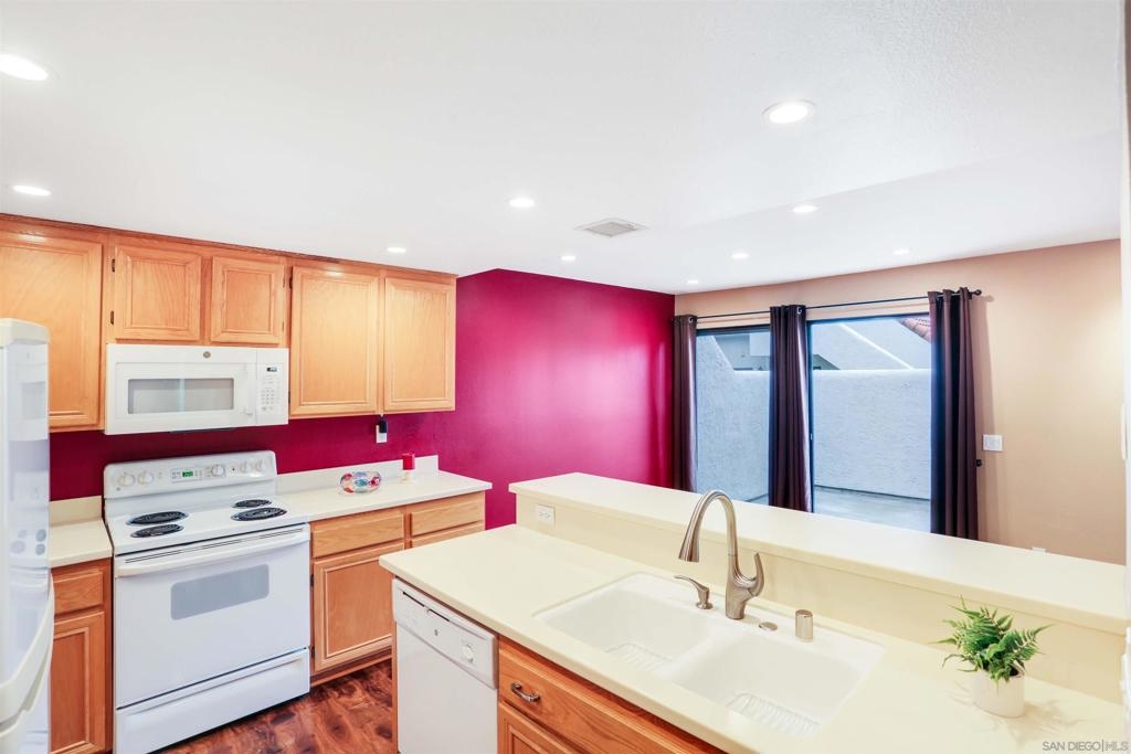 "Home sweet Home" is the theme that exemplifies this cozy 2-bedroom, 2-bathroom condo nestled in one of the quieter locations of the Bernardo Pines community. You'll appreciate the open floorplan and vaulted ceilings the moment you step through the front door. A brick hearth fireplace is the focal point of the oversized family room which opens to the adjacent dining and kitchen area. Views to the ample walled patio further enhances the overall open and welcoming feeling. (Supplement) The primary bedroom is generously proportioned and features a large walk-in closet, separate vanity, and stall shower/toilet area. The guest bedroom has 2 closet spaces and the guest bathroom features a tub/shower combo and is located just past the louvered door full-size side-by-side washer/dryer closet. Amenities abound with a community pool - spa - exercise facility - tennis court - and play area. The lush, mature landscape adds to the beauty and charm of the Bernardo Pines community. Located with easy freeway access, multiple eateries, shopping and community facilities - this Bernardo Pines condo is the perfect spot to call home! NOTE: The pictures that include furniture are "Virtually Staged" to assist with a potential visual representation of the rooms photographed.