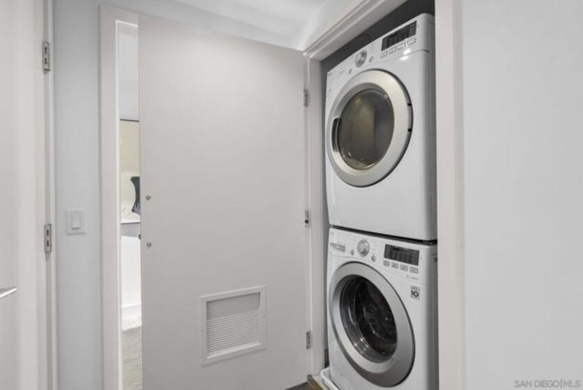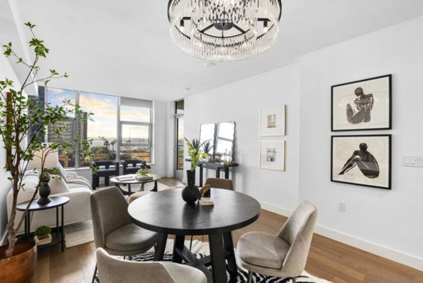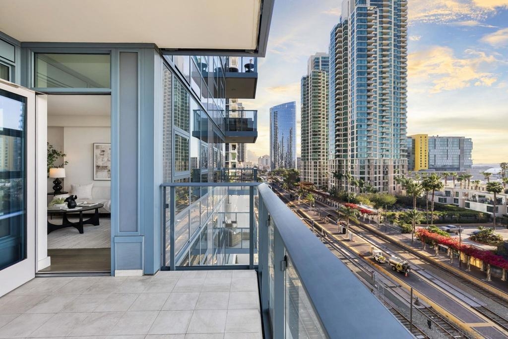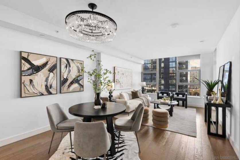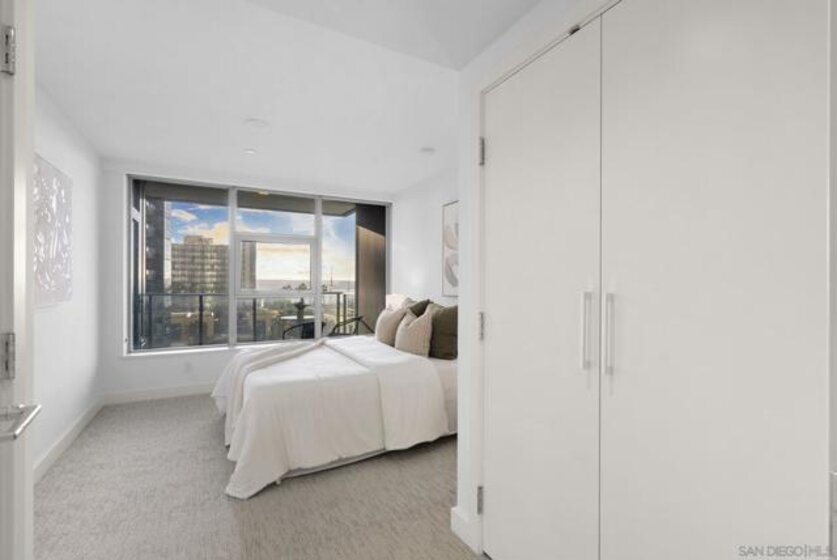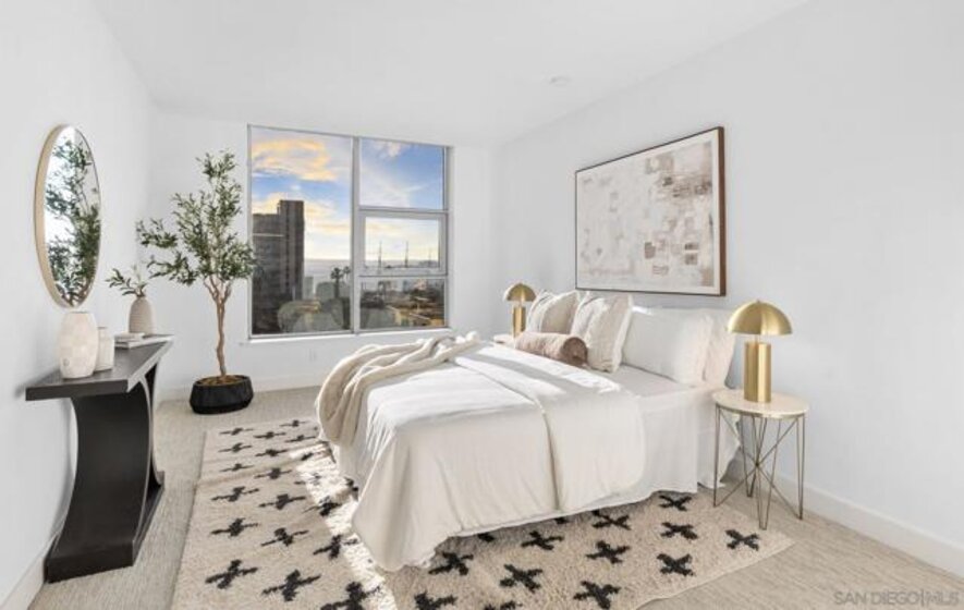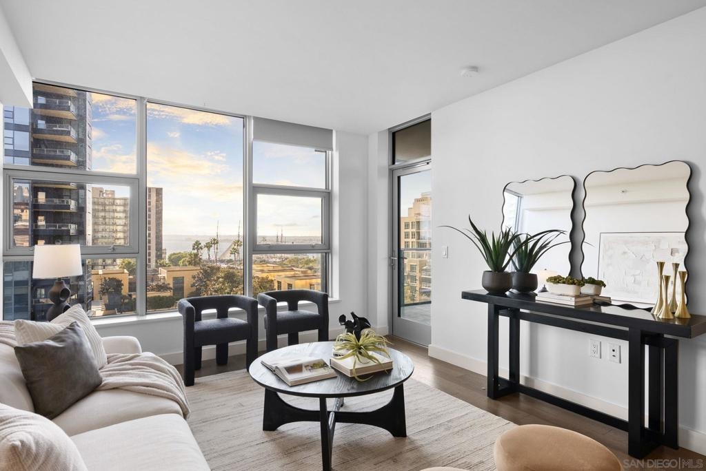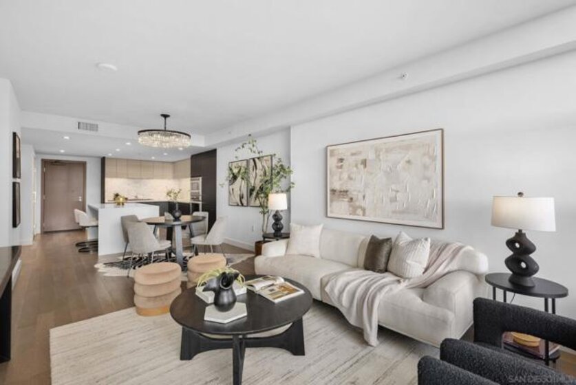 Welcome to Savina Residence 609, a west-facing 2-bedroom, 2-bath home showcasing exceptional bay and city views from every room. This thoughtfully designed residence features an open-concept layout with a spacious great room that easily accommodates both living and dining, all framed by expansive windows and natural light. The kitchen offers bar seating and flows seamlessly into the main living area, making it ideal for both everyday living and entertaining. The primary suite is generously sized and features a massive walk-in closet, while the second bedroom also enjoys sweeping views, creating a bright and elevated living experience throughout. This property comes with 1 parking space and 1 storage space. Additional highlights include one assigned parking space and a well-balanced floor plan that maximizes both functionality and comfort. Savina residents enjoy over 24,000 square feet of resort-style amenities, including a stunning lobby with concierge, business lounge, and a state-of-the-art fitness center with outdoor yoga terrace. Relax and recharge in the spa with sauna and steam room, or unwind on the pool terrace featuring cabanas, fire features, and communal dining areas. Additional amenities include a social lounge with chef’s kitchen and billiards, pet retreat with dog washing station, bike tune-up station, EV charging, and secure resident access. Experience elevated coastal urban living in one of Downtown San Diego’s most sought-after communities.