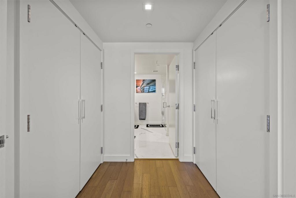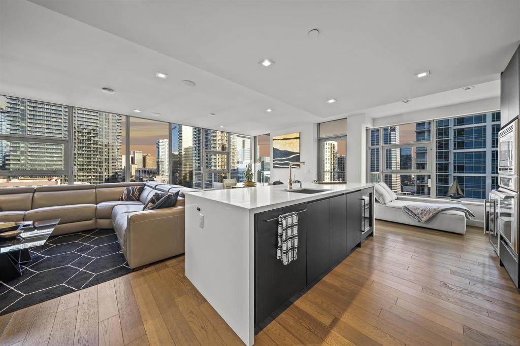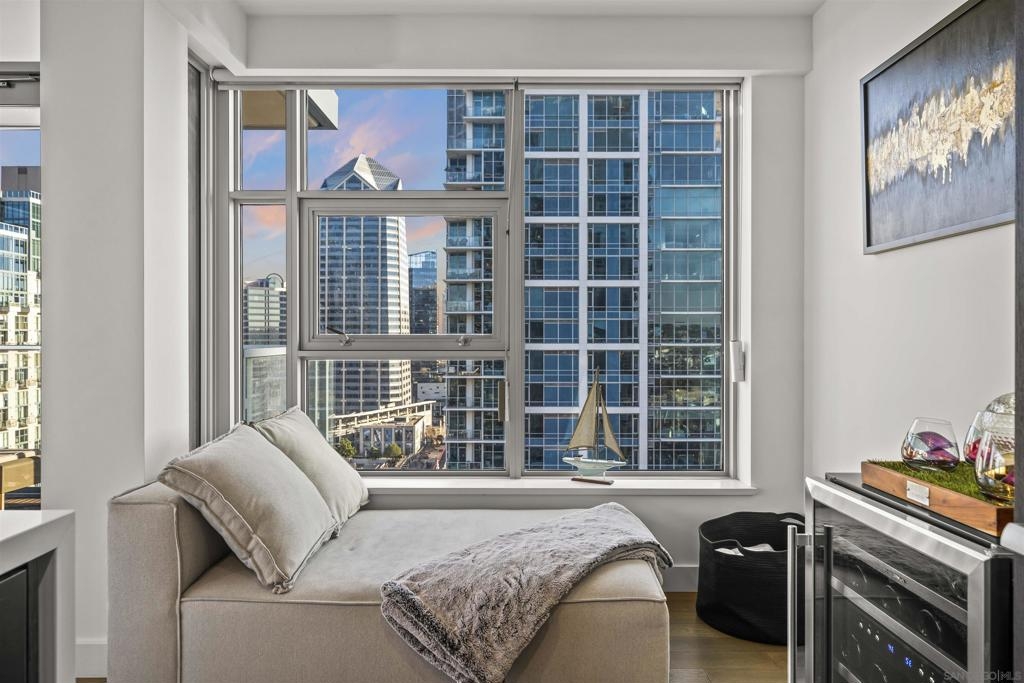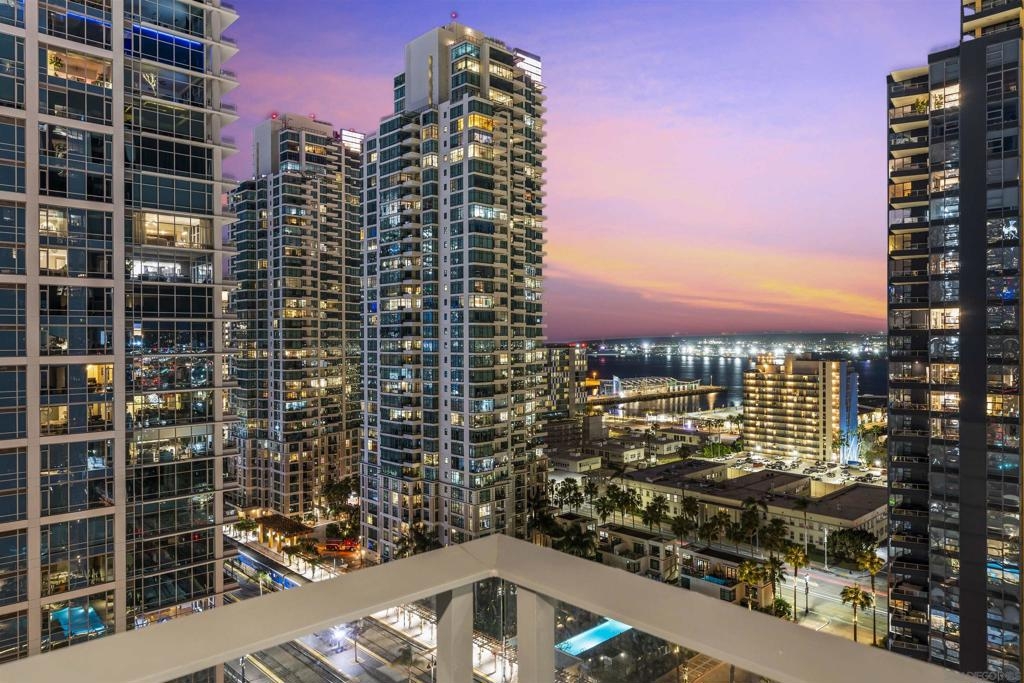 Welcome to Savina residence 1706, where luxury meets location. This 2BR/2BA + nook southeast corner floorplan has rarely been available since the building’s completion. Perched on the 17th floor, this home boasts breathtaking views of the bay, San Diego city skyline, the cruise ship terminal, and even overlooks the Savina pool. Inside, the space is bathed in natural light thanks to a full wall of windows in the open living area. The thoughtfully designed layout includes a primary suite with an en suite bath, a secondary bedroom and separate guest bath, a versatile nook perfect for a home office or cozy reading spot, and a private balcony to soak in those signature San Diego sunsets. This residence is loaded with upgrades: engineered hardwood flooring throughout, additional recessed lighting installed throughout, automated shades, a built-in wine fridge, and an integrated AV/sound system. It also comes with two parking spaces and a storage unit. Perfectly positioned between the Waterfront and lively Little Italy, Savina provides the best of urban living. Residents enjoy over 24,000 square feet of hotel-inspired amenities, including a resort-style pool and spa, BBQ deck, a state-of-the-art gym + yoga terrace, social lounge, business center, 24-hour building staff, community EV charging stations, a pet retreat + dog wash, and Google Fiber Webpass internet included in the HOA dues.