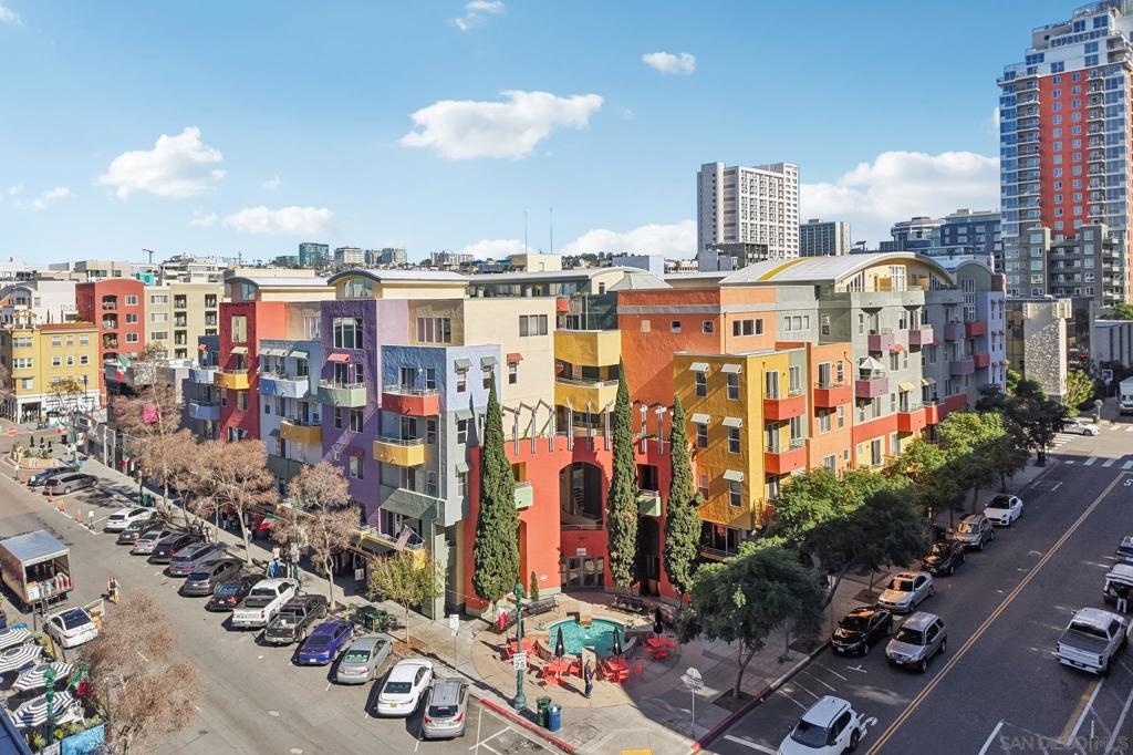Rarely available live/work opportunity in the heart of Little Italy. This unique Shopkeeper-style property offers a street-level commercial space with an adjoining two-bedroom, 2.5-bath townhome-style residence above—ideal for owner-users, creatives, or investors seeking versatility and income potential. The ground-floor commercial space, currently rented, approx 600 sq ft, includes a half bath and interior stairs leading to the residence. A lockable door separates the two spaces. The residential condo is light and bright, featuring a formal entry and an open-concept layout with a spacious kitchen, living, dining, and office area. This level also includes a convenient half bath and opens to a generous balcony with city views. Upstairs, the primary suite offers a walk-in closet with custom shelving and a well-appointed bathroom with a walk-in shower. The second bedroom is also en suite, complete with a shower/tub combination, while hallway storage cabinets provide added functionality. Additional highlights include in-unit laundry and two side-by-side parking spaces. Located within Village Walk, a charming community inspired by the colors and textures of Burano, Italy, residents enjoy courtyards, piazzas, fountains, a fitness center, and a community room. Step outside to experience the very best of Little Italy—top-rated restaurants, boutiques, coffee shops, nightlife, and the renowned Little Italy Farmers Market. Just blocks away, enjoy scenic harbor walks and bay views, with easy access to the Marina District, Gaslamp Quarter, East Village, Petco Park, and The Rady Shell.