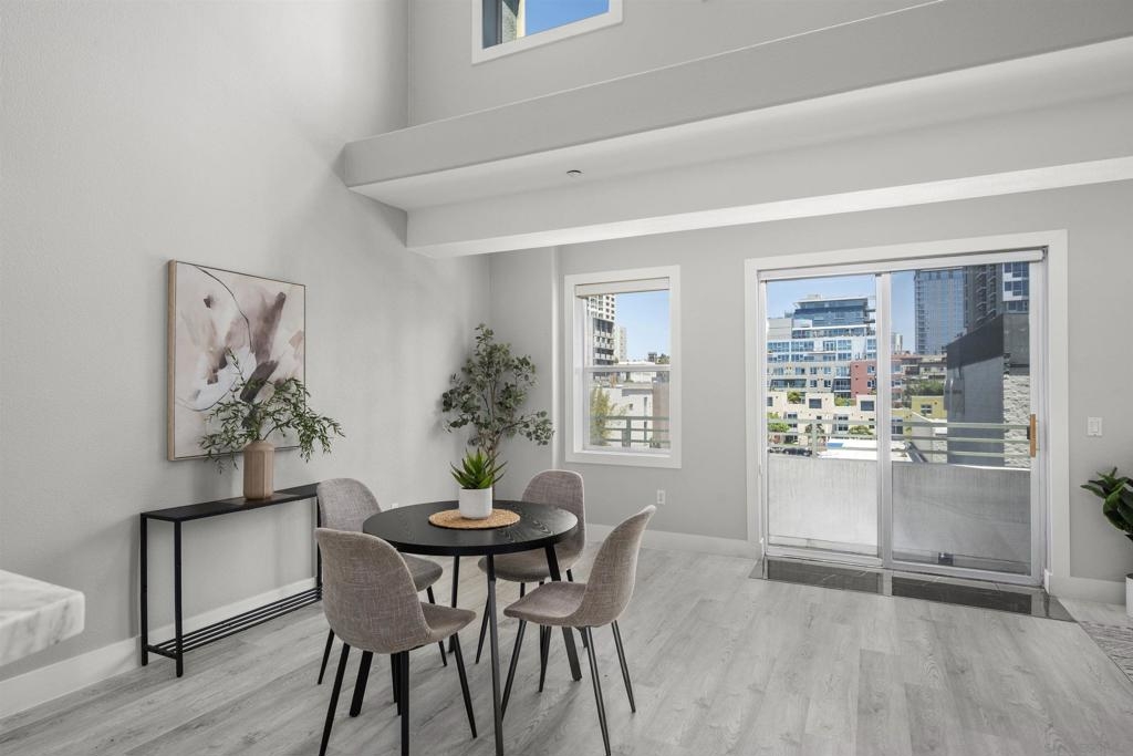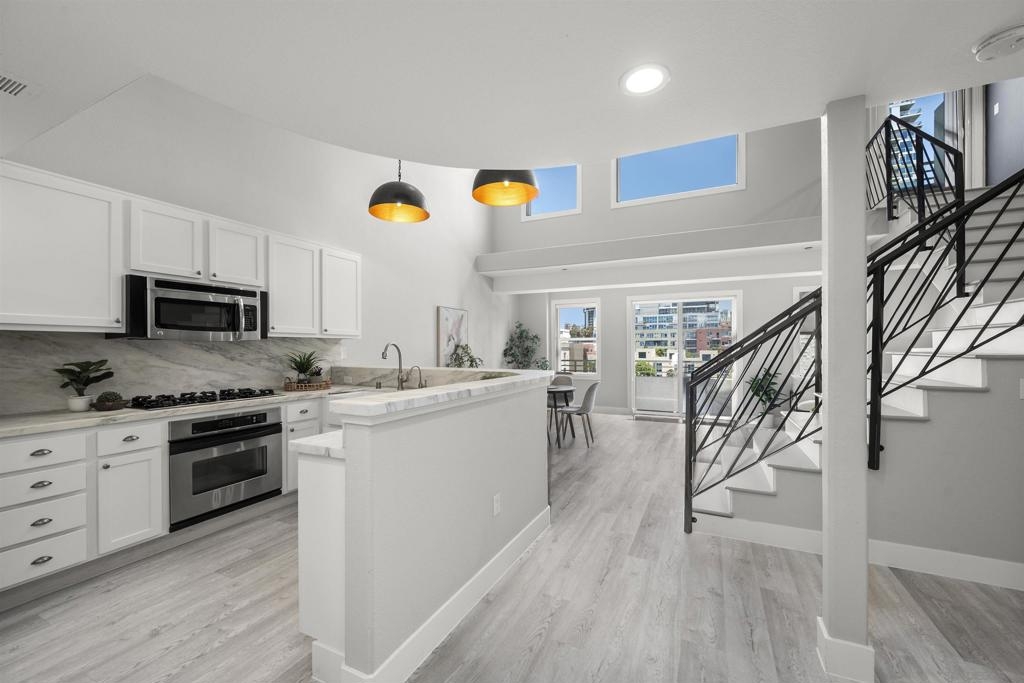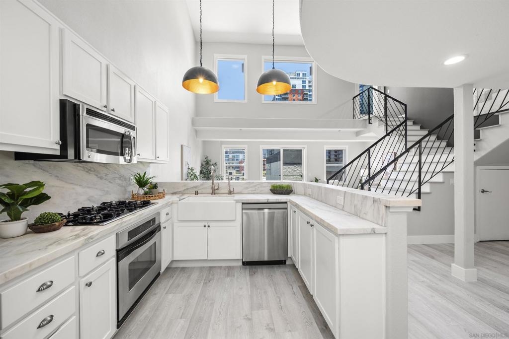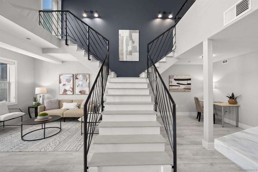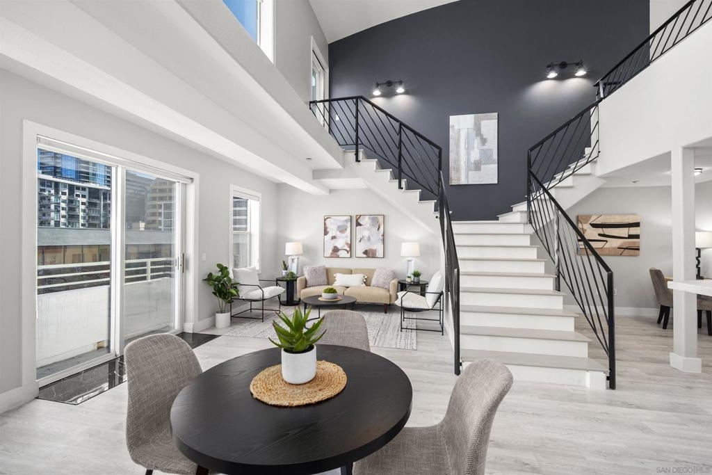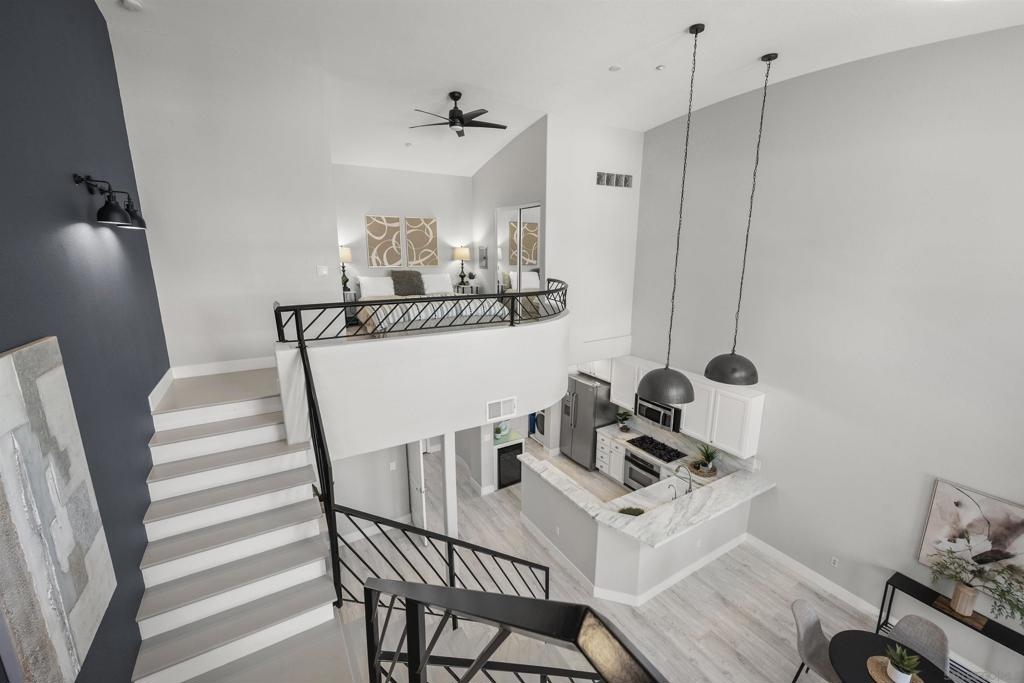 PRICE IMPROVEMENT! TOP-FLOOR, CORNER UNIT, 2-STORY LOFT w/SPLIT GRAND STAIRCASE! Immerse yourself in the lively culture of LITTLE ITALY with its renowned restaurants, bars, and cafes like Born & Raised, Craft & Commerce, and the vibrant Piazza Della Famiglia. Enjoy proximity to the San Diego Bay, Waterfront Park, and the Farmer's Market, all within 3 blocks! This one-of-a-kind unit offers 1,055 square feet of modern living with an open loft-style bedroom and 2 full bathrooms. As you step inside, you'll be greeted by towering 20-foot ceilings and brand new luxury vinyl flooring. This fully remodeled kitchen features elegant marble counters with a wraparound bar, perfect for hosting and entertaining. Enjoy the convenience of an In-Unit Full Size Washer/Dryer, and unwind on one of the two oversized private balconies. This loft-style penthouse is thoughtfully designed with a double staircase adorned with custom wrought iron railings, providing an artistic touch to the space. The upstairs area offers a full bath, loft style bedroom, Walk-In Closet, Balcony, and automatic blinds. Downstairs offers 1 full bath and a flex-space to be used as an optional bedroom, den, or office. 1 assigned, oversized, underground parking spot, that includes storage and additional space options (see pics). Village Walk amenities include a beautiful common courtyard with a waterfall, large fitness center, and a community rec room for social gatherings. This top-floor gem offers the ultimate blend of comfort, luxury, and urban convenience. Make it yours today!