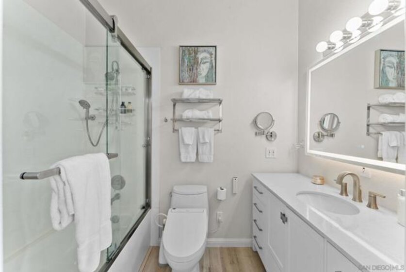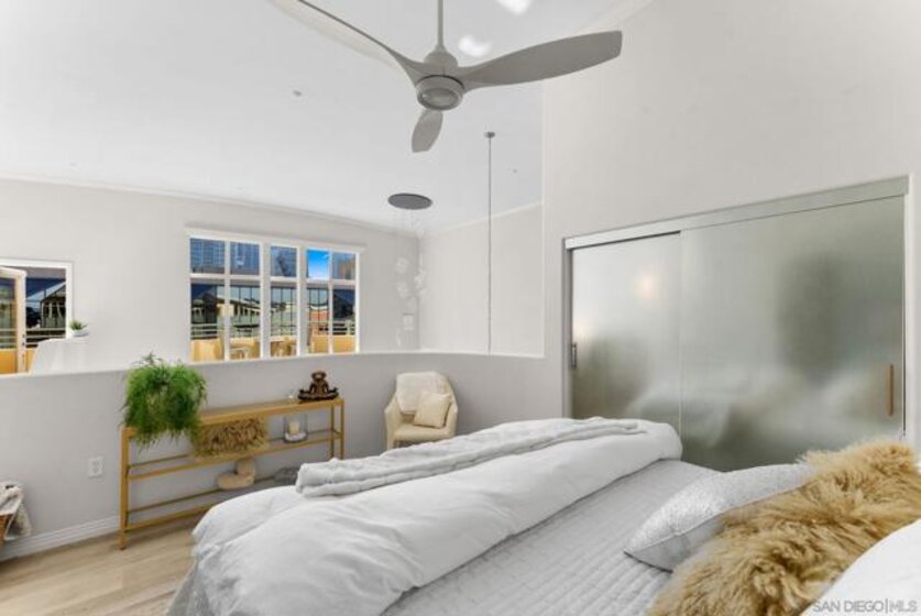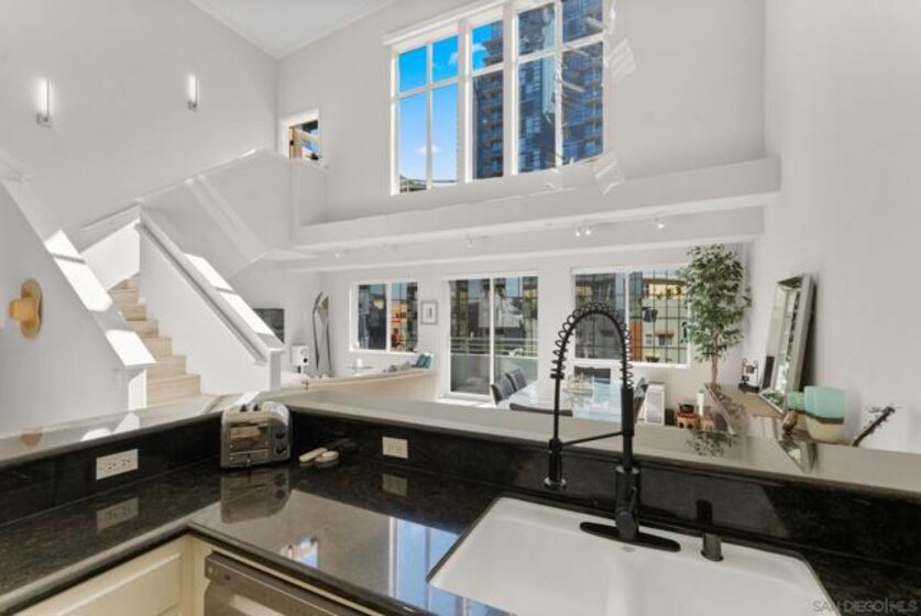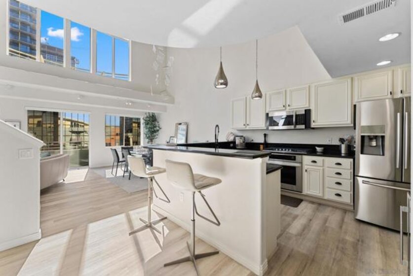 Welcome to 1501 India St Unit 613, nestled in the heart of Little Italy, offering STUNNING Bay and City views. This absolute CHARM of a unit is located on the top floor of the highly sought-after “Village Walk” community. Upon entering, you are greeted by alluring 20-ft ceilings and a delightful open concept that magnifies every inch of the property. The enormous kitchen along with the large living room and wide-ranging dining area offers the perfect space to enjoy, gather, and entertain while the bedroom upstairs provides an optimal space to enjoy peace and serenity directly across from the balcony—the perfect outdoor space to take in the breathtaking views. The primary bathroom is highlighted by new fixtures, a new barn door, a new vanity and high-end vanity mirror, and a new bidet. The optional bedroom downstairs offers multiple possibilities to maximize the space, whether it be an office, a den, or whatever suits your lifestyle. Additional upgrades include luxury electric shades to complement the dual-pane windows, a new high-end chandelier, new lighting fixtures, a built-in wine cooler, and more. A short elevator ride downstairs leads you to San Diego’s finest entertainment options, such as the San Diego Bay, multiple award-winning restaurants and coffee shops, and the renowned “Little Italy Farmers Market.” In addition to the highly desirable walkability, this luxurious unit offers easy access to the 5 and 163 freeways, as well as a short commute to San Diego International Airport, allowing for ease and convenience of travel in every regard. Come have a look!