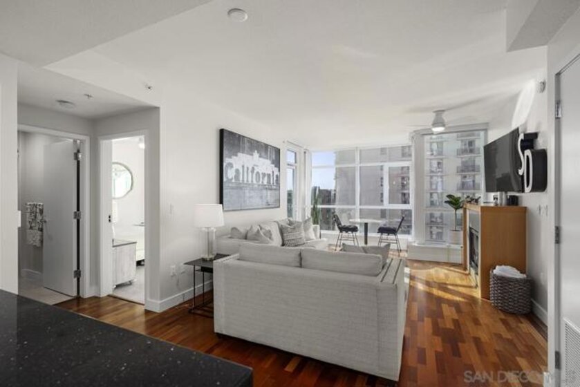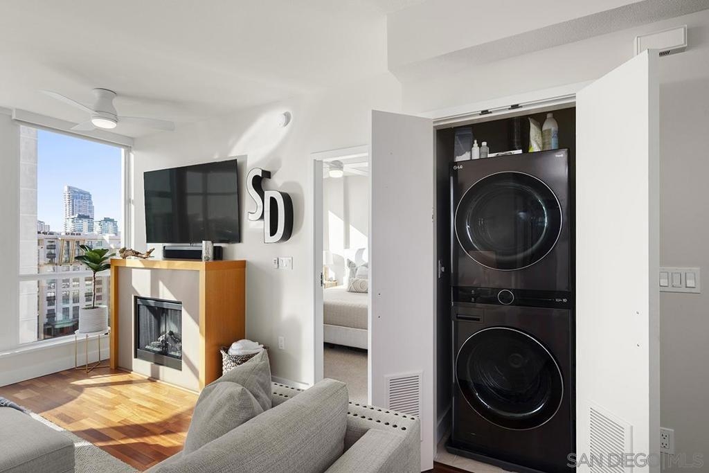 Pride of ownership shines in this impeccably maintained, move-in-ready residence at The Legend. West-facing with peek bay views, the private balcony is the perfect spot to soak in San Diego’s signature sunset skies. Cherry wood floors, an ambient fireplace, and walls of windows flood the home with natural light, while the split floor plan offers ideal privacy. The kitchen features stainless GE Profile appliances, recessed lighting, and a breakfast bar with statement drop lighting. The primary suite includes an ensuite bath with dual vanity and step-in shower. With Petco Park next door, enjoy games and concerts from the iconic 7th-floor Legend Terrace. PLUS secured parking and storage. Live where the energy is and Downtown living truly delivers. The Legend is the only residential high-rise to be built inside the gates of a Major League Ballpark and the only residential tower to be built on the three-acre Park at the Park! This iconic building overlooking the Padres Ballpark will be treasured for generations with historic detailing preserved by Bosa to create a world class residential tower. Centrally located next to the Gaslamp Quarter and Marina District for convenient access to shopping and endless dining options. The Legend’s amenities include a second-floor rooftop deck looking out over Petco Park complete with pool and spa, a fully equipped fitness room, roof garden, barbeque area, steam, sauna and changing rooms. Your guests and clients will love 'Club Legend' located on the seventh floor, complete with a huge roof deck overlooking Petco Park and an outdoor fireplace lounge fully-equipped with indoor and outdoor kitchen and BBQ. An elegant courtyard entrance, creating a private enclave approaching the lobby provides a fitting and impressive sense of arrival for residents and their guests. The concierge service and 24-hour security add a sense of belonging while an ambiance of refinement and contemporary sophistication is apparent throughout the building.