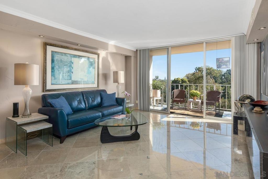 Coral Tree Plaza 6th floor, SW corner unit with a gorgeous view of treetops and the Balboa Park Tower in the distance. Stunning limestone flooring and numerous upgrades, makes this a "must-see" in this high rise condo complex at the end of 7th Avenue. One of the largest balconies at 33' feet expands your living space with an additional 165 sq. ft. for entertaining! Upgrades include recessed lighting, upgraded showers, large walk-in closets in both bedrooms, remodeled kitchen, glass block wall in primary bathroom, and a Neptune washer/dryer. Urban living at its finest, just a short walk to Whole Foods, dining, Uptown District, Balboa Park and nightlife located in the very heart of Hillcrest. It is hard to believe that this quiet condo, with such a gorgeous view, is located so close to everything. This condo has 2 dedicated parking spaces and a storage locker. Also in the underground parking area is a bike storage area and car wash. Amenities include tennis/pickle ball court, guest suites, fitness center and clubhouse that has a kitchen, fireplace & pool table. Heated pool & hot tub are close to the clubhouse.