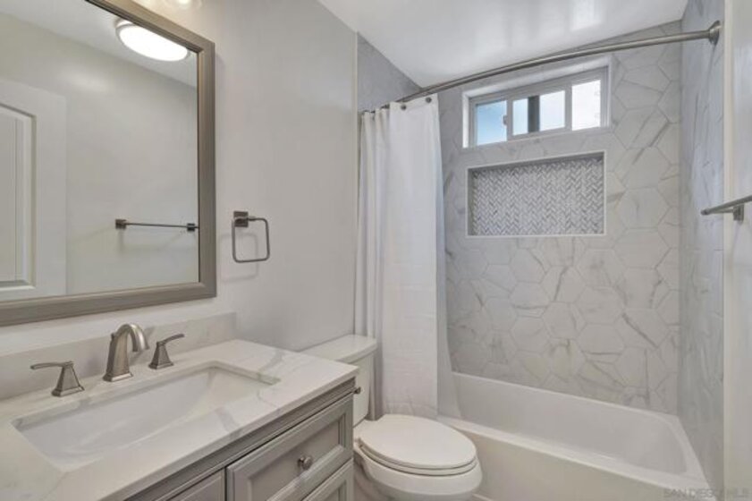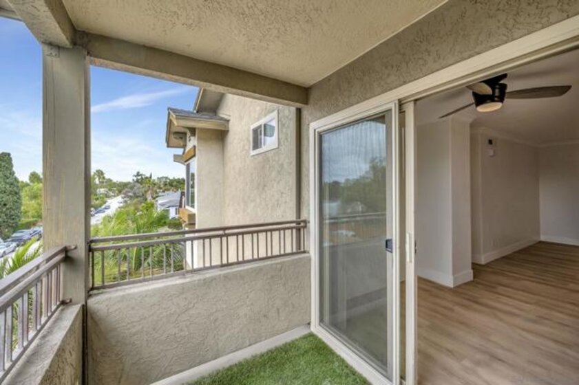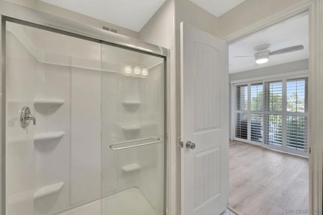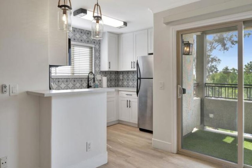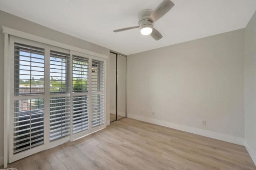 Stunning top floor condo with gorgeous finishes! This has to be the most upgraded and best located condo in the complex! There is stylish LVP flooring with dual pane windows and sliders throughout. The kitchen is amazing with modern cabinets, counters and tile work. The dining room has a private patio with views. The primary bedroom features another private balcony as well as a beautiful bath with walk-in shower. Both bedrooms have full-length mirrored doors and the hall bath has a tub-shower condo with wonderful tile work. There is central heating and AC as well as a detached two-car tandem garage with tall ceilings. This wonderful property is centrally located and close to SDSU.