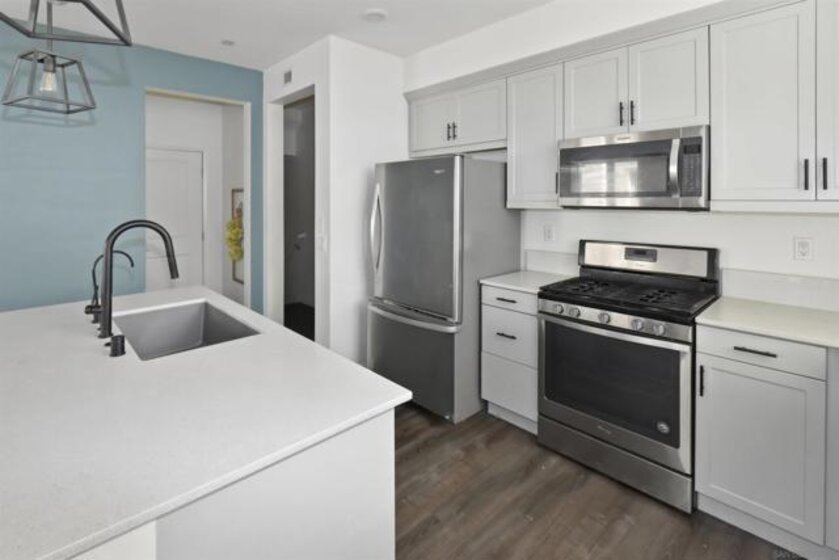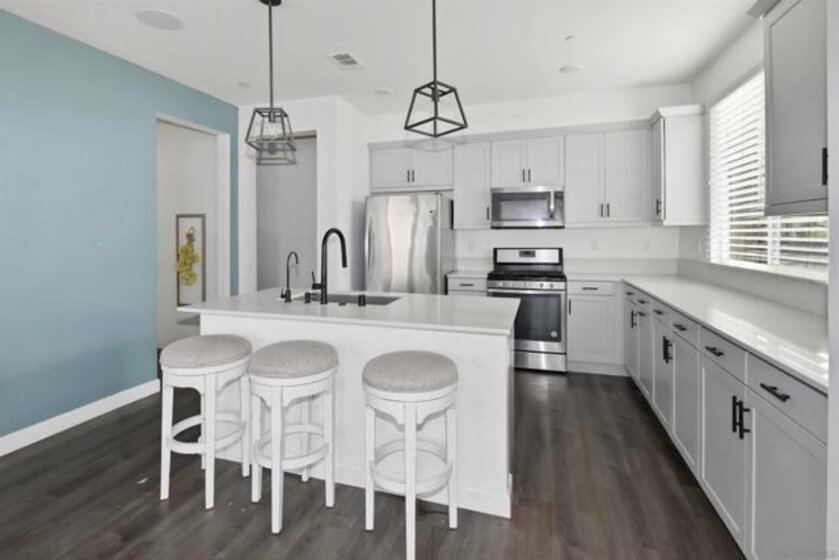 Beautifully upgraded 3 bedroom, 2.5 bath home offering modern finishes and comfortable living throughout. Interior highlights include luxury vinyl plank flooring, quartz countertops, silgranit sink, built in surround sound, reverse osmosis water system, upgraded washer and dryer, and an energy efficient tankless water heater. A dedicated parking space is conveniently located directly in front of the garage. Residents enjoy resort inspired community amenities including a fitness center, clubhouse with full kitchen, community room with two story balcony, outdoor grilling areas, multiple lounge spaces, a large pool with three lane lap swimming, spacious spa, and a children's beach style pool. Community services also include trash pickup, pest control, dog stations, and annual power washing. Ideally situated with convenient access to freeways, shopping, dining, and everyday amenities.
