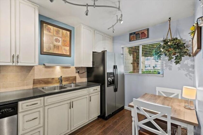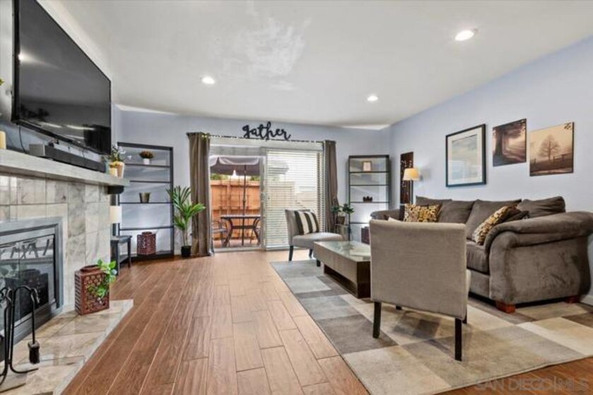 Two-story condo that lives like a townhome, offering 2 bedrooms and 1.5 baths in a centrally located community near SDSU, major medical facilities, shopping, public transit, and freeway access. The entry-level main floor features an open living and dining area with wood-look tile flooring, recessed lighting, accent walls, a gas-starter fireplace with built-in cabinetry, and central A/C. The layout flows comfortably for everyday living, with a functional kitchen offering ample cabinetry, an adjacent dining space, and a refrigerator that conveys. A convenient half bath is located downstairs for guests, along with additional under-stair storage. Upstairs, both bedrooms are generously sized and share a centrally located hallway bathroom. The layout features a vanity area positioned just outside the tub/shower and toilet area. Enjoy a private patio with easy access to the community pool, spa, grill area, and community laundry room, along with a front greenbelt area maintained by the HOA. The unit offers entry-level access and includes two assigned tandem parking spaces (#183) located just a short walk away, without the need to navigate interior corridors or buildings. Legally a condominium; layout and exterior access give a townhome-style feel. Entry-level unit with exterior access—no interior corridors. Two assigned tandem parking spaces located a short walk from the unit. Pre-home inspection and clear termite report were completed in September and are available for agent review. Solar panels installed; buyer to independently verify system details and terms. Interior living spaces are notably quiet despite proximity to major freeways. Refrigerator conveys. HOA covers water, trash, sewer, exterior building maintenance, and common area landscaping. Community amenities include pool, spa, grill area, greenbelt areas, and community laundry. Convenient location near SDSU, medical facilities, public transit, and major commuter routes.