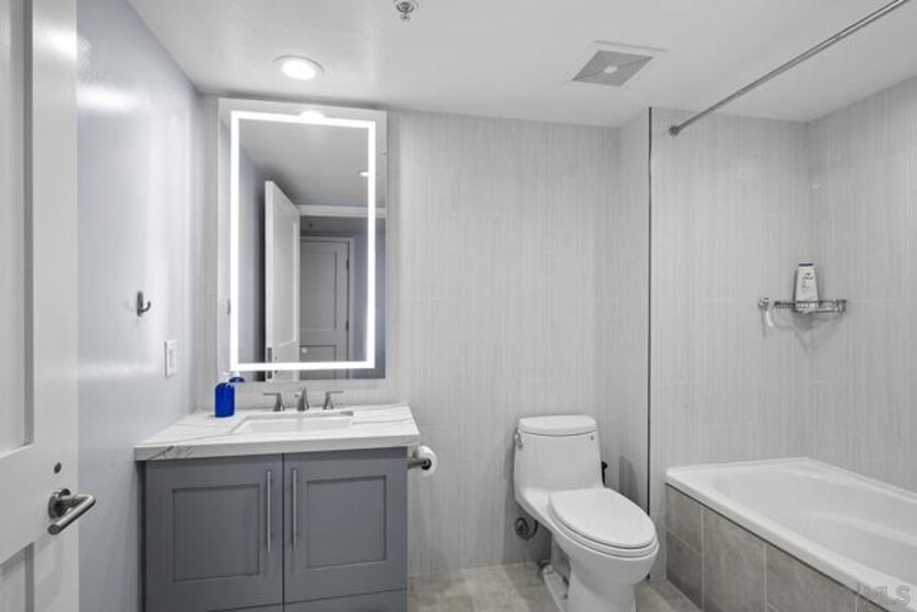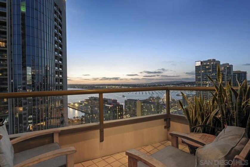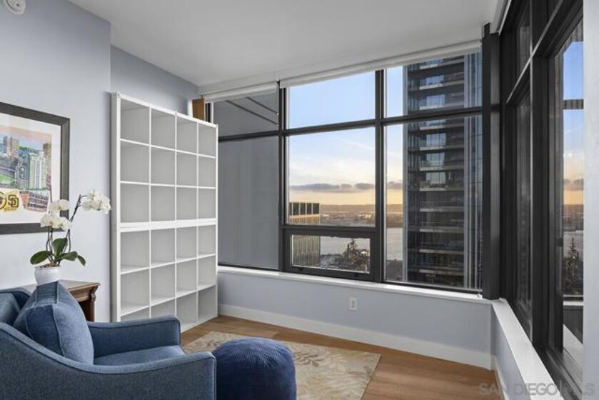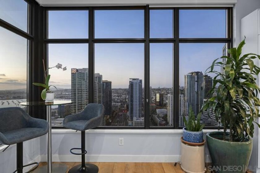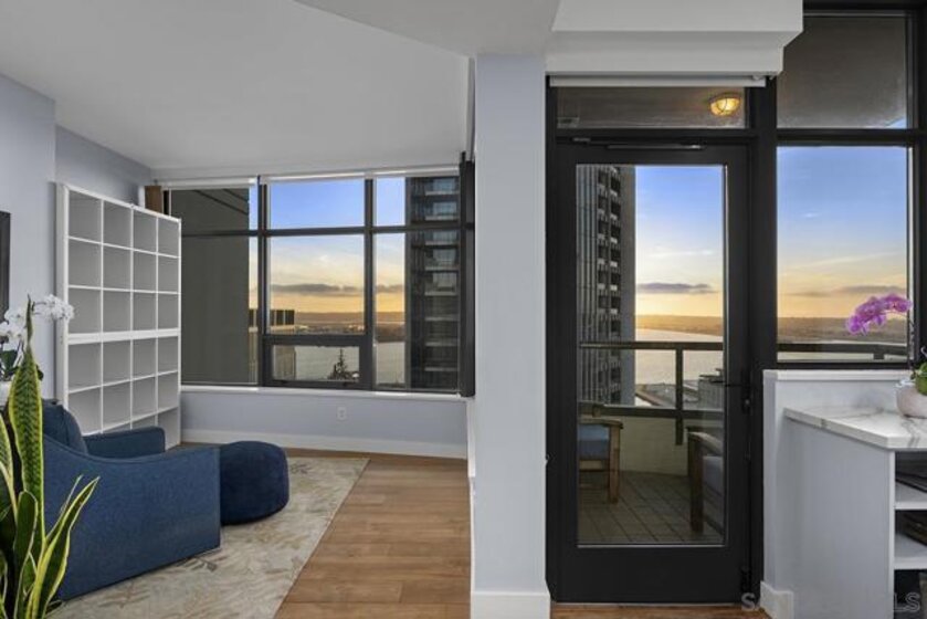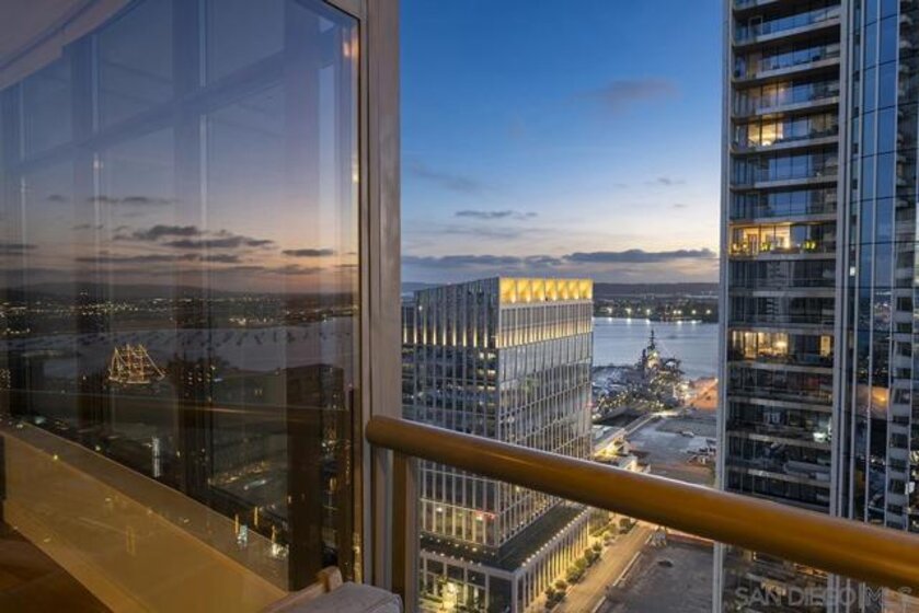 Come experience true high-rise living in one of only two residences with this coveted floor plan at Electra. Perched on the 29th floor, this fully reimagined northwest corner home captures sweeping views of the bay, Point Loma, and the sparkling city skyline from every room. A private balcony sets the stage for unforgettable San Diego sunsets. Thoughtfully redesigned for both style and function, the residence showcases wide-plank reclaimed teak flooring, a sleek linear fireplace with stone surround, and a striking petrified wood mantel. The open-concept kitchen is a true standout created for those who love to cook and features a Wolf range, built-in Sub-Zero refrigerator, Miele dishwasher, beverage chiller, quartz countertops, farmhouse sink, subway tile backsplash, and a custom glass-front display cabinet. Wake up to blue water views in the serene primary suite, complete with a spa-inspired ensuite bath offering dual vanities, a modern LED mirror, and a step-in shower. The versatile second bedroom, currently styled as a den/office, retains its closet and can easily be converted back to a full bedroom. The guest bath has also been tastefully upgraded with quartz surfaces and new cabinetry. Additional highlights include side-by-side parking on P1 with EV charging and dedicated storage on the same level. Ideally located in the vibrant Columbia District, you’re just moments from Waterfront Park, Little Italy, and Seaport Village. Rarely does a home combine this level of design, location, and view come along often so don’t miss your opportunity. Offering a fabulous location in the coveted Columbia District, you will love being only a short walk to Waterfront Park, Seaport Village, The Headquarters, and the brand-new Rady’s Shell at Jacobs Park, a unique live music venue and home of the San Diego Symphony! Also enjoy proximity to the future life science and biotechnology research development The Research and Development District (The RaDD) at the Embarcadero and the sustainable tech-focused Horton Plaza Redevelopment in the center of the city. Electra has the unique distinction of being built around the historical 1928 SDG&E Station B. Residents can take advantage of an array of services including a concierge, security, and guest parking spaces available by reservation through a simple mobile app. Unwind and relax in the steam room or sauna, resort-style pool and spa, fitness center, and Electra Park on the 5th floor surrounded by lush landscaping and a romantic outdoor fireplace and top-of-the-line barbecues.