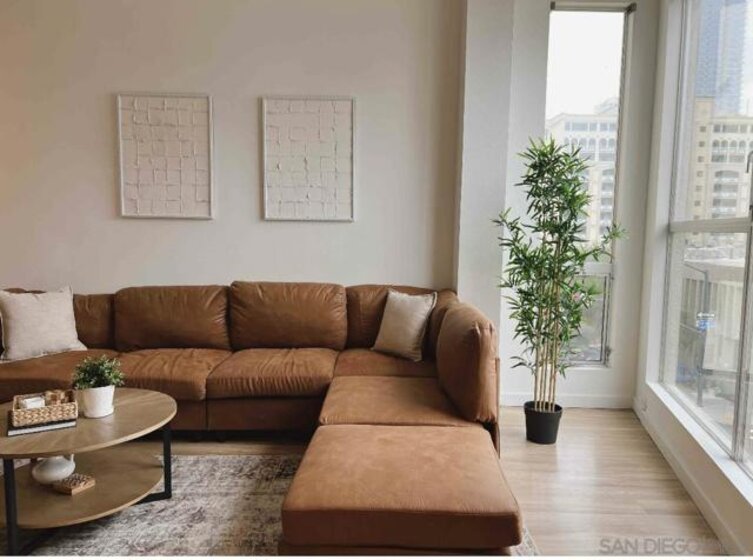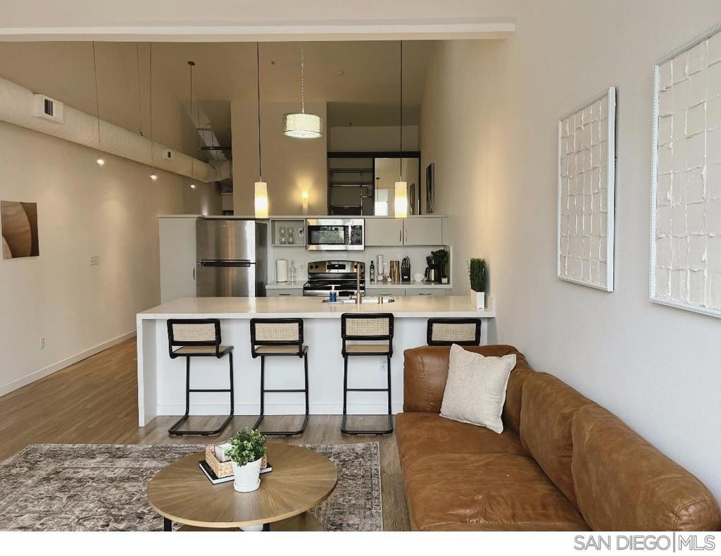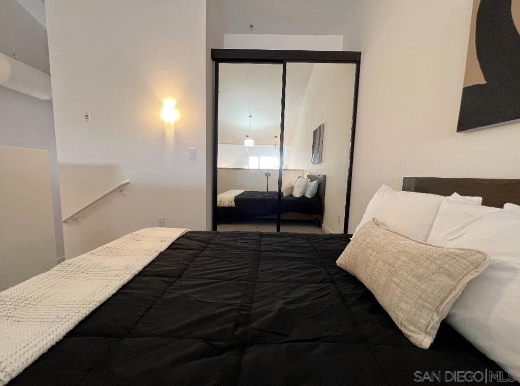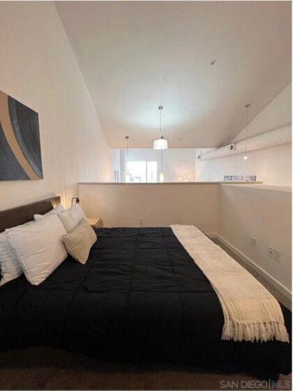 TOP-FLOOR GASLAMP LOFT - LIVE IT OR RENT IT! Extensively upgraded 746 sqft platform loft with excellent mid-term rental income potential in Downtown San Diego's most walkable neighborhood. This sun-drenched urban retreat features soaring 15-ft vaulted ceilings, industrial-exposed ducting, and meticulous designer upgrades including: NEW luxury vinyl flooring throughout, fresh contemporary paint, completely renovated kitchen with show-stopping waterfall-edge island countertops, new stainless sinks and modern fixtures, custom oversized closet, in-unit washer/dryer (2024), and brand NEW AC unit (2024) for optimal comfort and efficiency. The open living space flows seamlessly while the loft-style bedroom offers privacy with pony-walls - a layout renters and residents love. One assigned space in secure underground garage included. Building amenities: fitness center and outdoor BBQ/entertainment area with recent common area enhancements (2023). LOCATION IS EVERYTHING - walk to Petco Park, new Gaslamp Promenade, harbor, 100+ restaurants/bars, trolley access, and endless entertainment. Pet-friendly building welcomes your furry friends. VA APPROVED for qualified buyers. Perfect for investors seeking rental income (30+ day minimum rentals allowed), urban professionals wanting the ultimate downtown lifestyle, traveling professionals needing flexible housing, or owner-occupants who want the option to rent when away. This is your chance to own in San Diego's premier entertainment district with flexibility to occupy or generate income. HOA $652/mo. Priced to move.